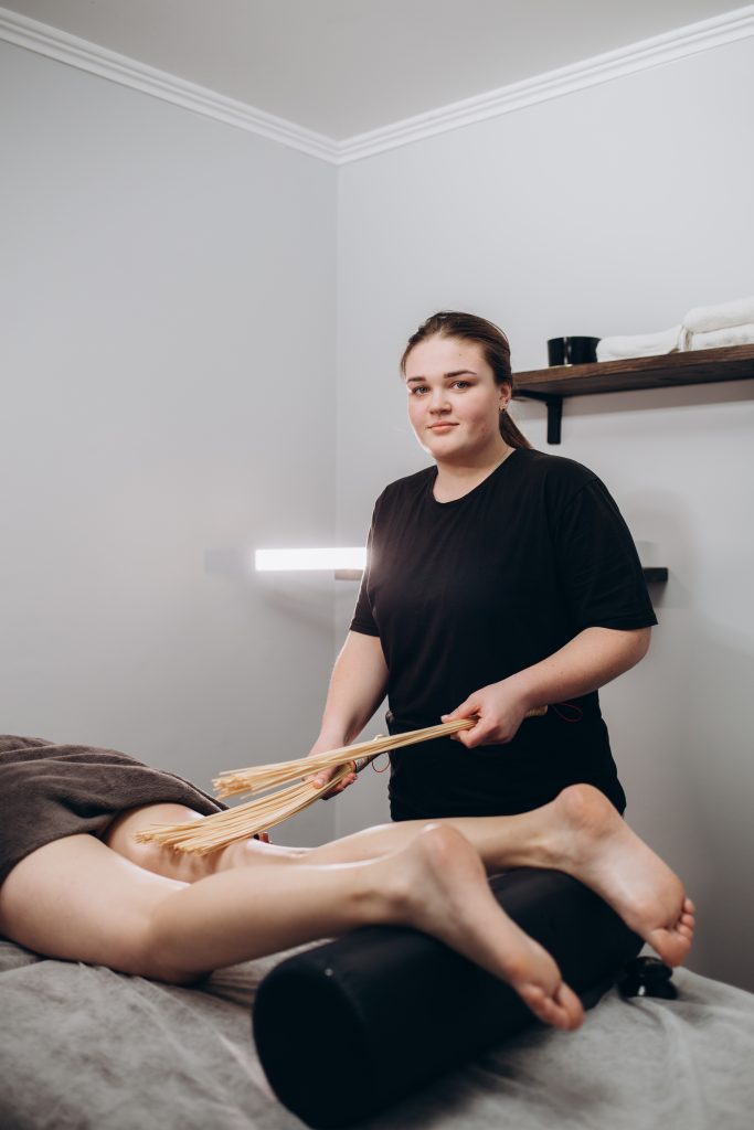 The session begins with gentle warm-up strokes using hands or wooden tools to relax the muscles and prepare the body for deeper work. This also increases blood flow to the target areas.